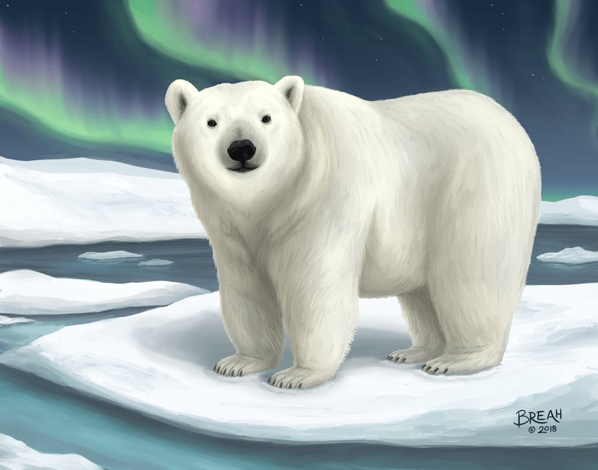 Perhaps one of the most iconic animals of the Arctic, it is the largest of its species and the largest carnivore on land. Females weigh between 300 – 550 lbs. (120 – 250kg) and can be up to 8 feet (2.4m) tall when standing, while males can weigh as much as 1500 lbs. (680kg) and stand up to 10 feet (3m) tall. This powerful predator is the Polar Bear.