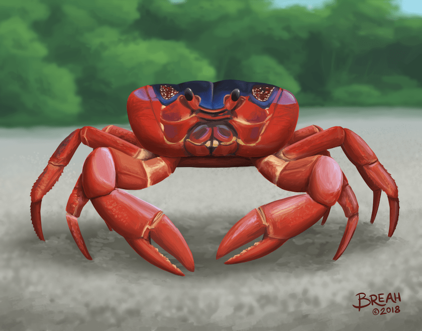 Christmas Island Red Crabs are around 4.5 inches (11.6 cm) and commonly found in the island rainforests.