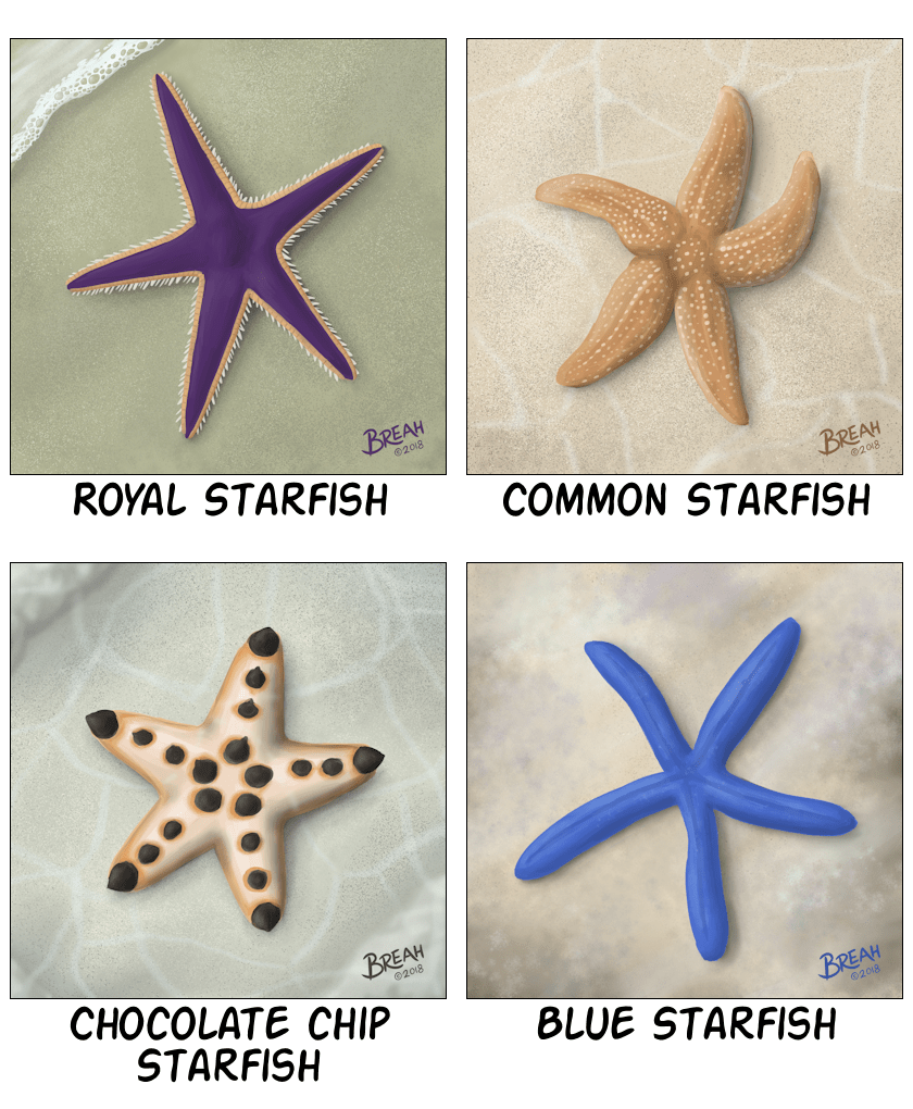 Starfish, or more appropriately called Sea Stars, are actually a type of invertebrate known as echidnoderms (from the Ancient Greek word meaning hedgehog, or spiny, skin).