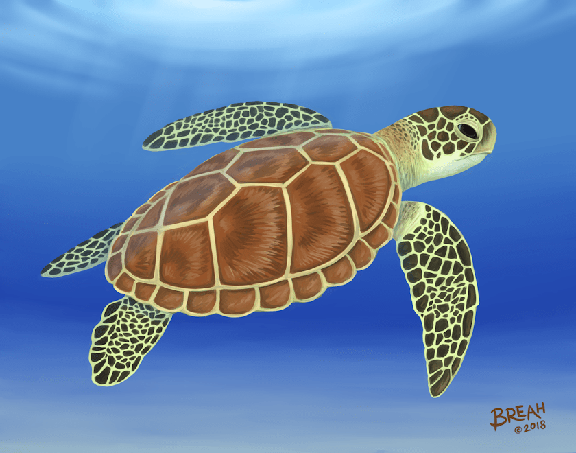 There are two Green Sea Turtle subspecies – the Atlantic green sea turtle and the Pacific green sea turtle. Green sea turtles are not named for their overall color, which ranges from dark green to brown to black, but for the color of their fat under their shell. In Hawai’i, the beloved green sea turtles are known as “honu”.